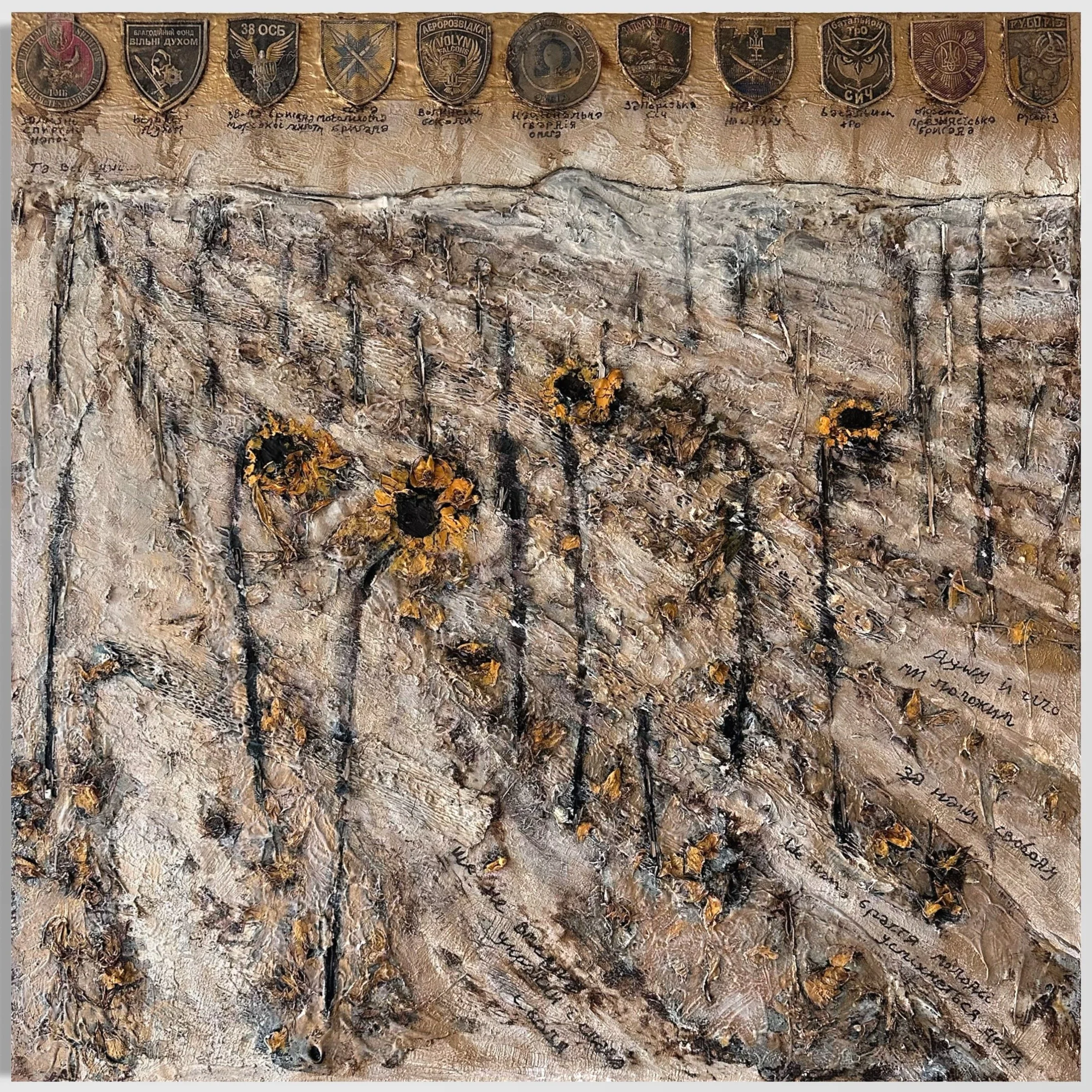 Media: acrylic, oil, bitumen, military patches and sunflower remains on canvas